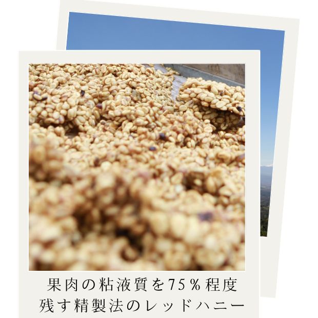 多くの人を魅了してやまない豊かな酸味と高品質な甘み。水洗処理を完全にコントロールしている農家だけが作ることのできるハニーコーヒー。果肉の粘液質を50〜100%残す技術でつくられるのが「レッドハニー」です。オレンジ、ブルーベリーなどの香りが複雑に絡み合い、まるでコーヒーとは別世界の飲み物のような・・・。コスタリカが生んだ傑作品です。