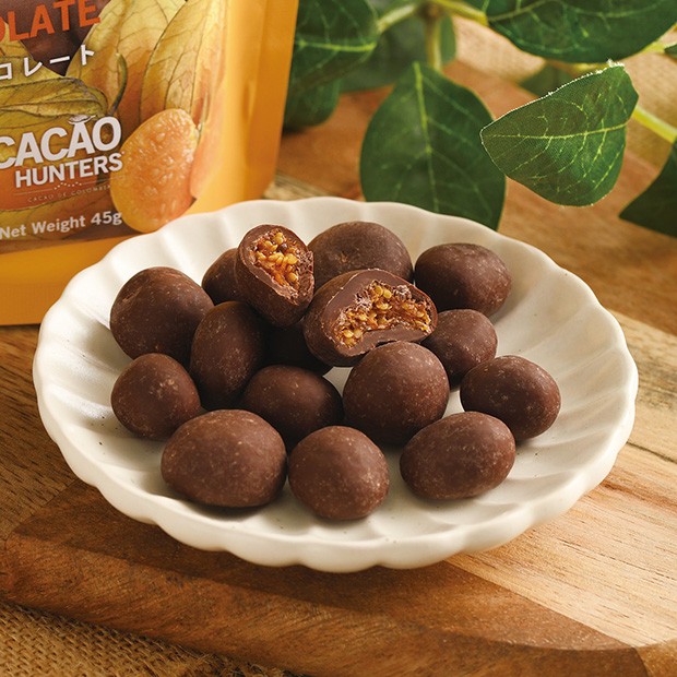 日本では食品としてあまりなじみのない「ほおずき」はCACAO HUNTERSの本拠地、コロンビアでは日常的に食られているフルーツです。 このチョコレートに使用している「ほおずき」は、コロンビアの中でも美味しいものを厳選し、収穫後すぐに乾燥して香味を閉じ込めたもの。噛めば広がるプチプチ食感と、チョコとほおずきの甘酸っぱい味わいを、楽しくお召し上がりください。