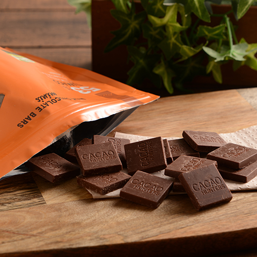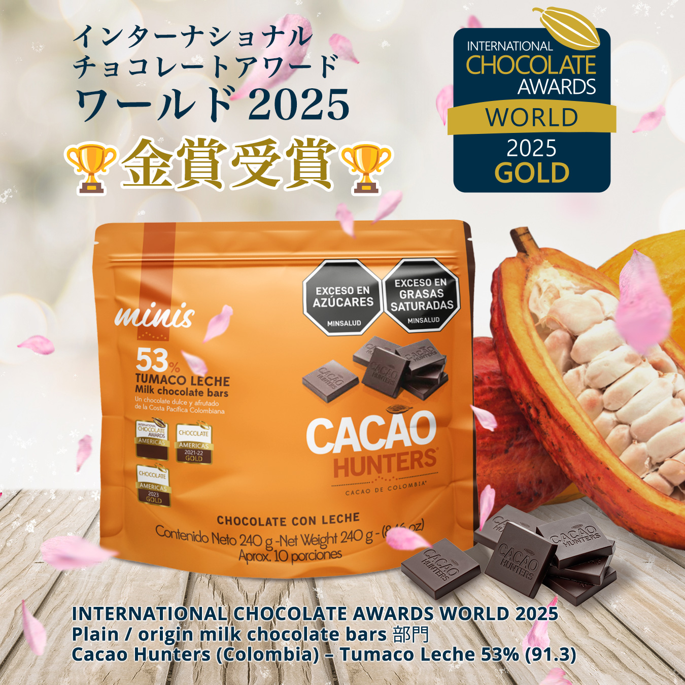 「CACAO HUNTERS」とは・・・ 世界15カ国のカカオ生産国を旅してきたカカオハンター小方真弓と、コーヒーの世界に従事してきたカルロス・ベラスコが、2013年12月にコロンビアで立ち上げたチョコレートブランド。 「カカオハンター」に “S” が付いているのは、私たちが探し出し、カカオ生産者によって育まれるカカオを、沢山の人々の手を介して1つのチョコレートに仕上げ、笑顔と幸せとともに分かち合うから。 このチョコレートを召し上がって頂く皆様方も、「CACAO HUNTERS」のお一人です。