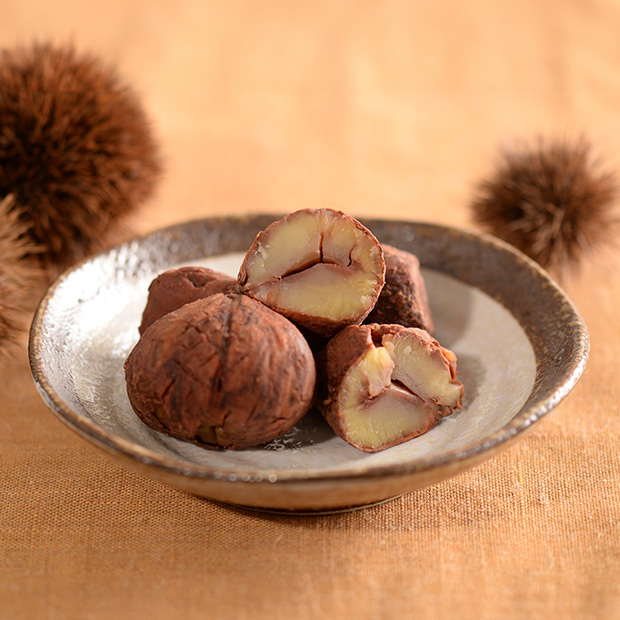 茨城県石岡市近辺の丹沢栗・筑波栗等を使用しています。ほっくりと柔らかい食感と上品な甘みは思わずうっとりしてしまうほどの美味しさ。一つひとつがうれしい大粒サイズで食べ応えもあります。和栗の皮をむき、薄い渋皮を少しだけ残してあります。和栗の味や香りを残すためです。渋皮ごと食べられます。