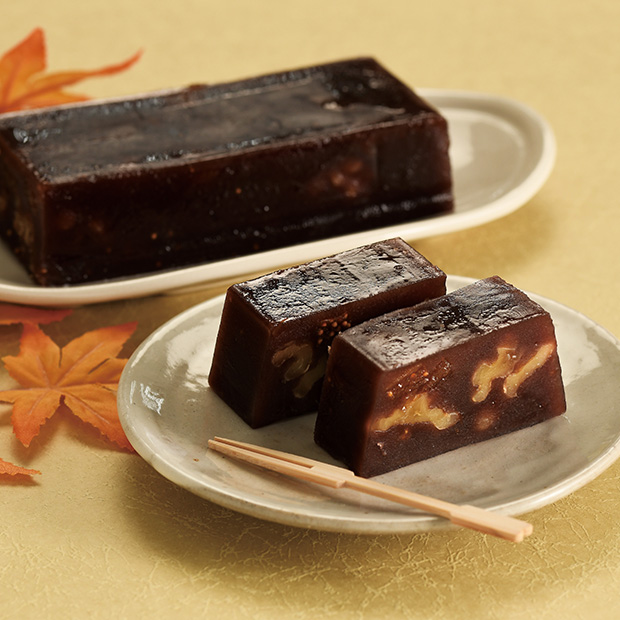 厳選した無漂白のいちじく・くるみ・あんずを閉じ込めた、華やかな練り羊羹です。