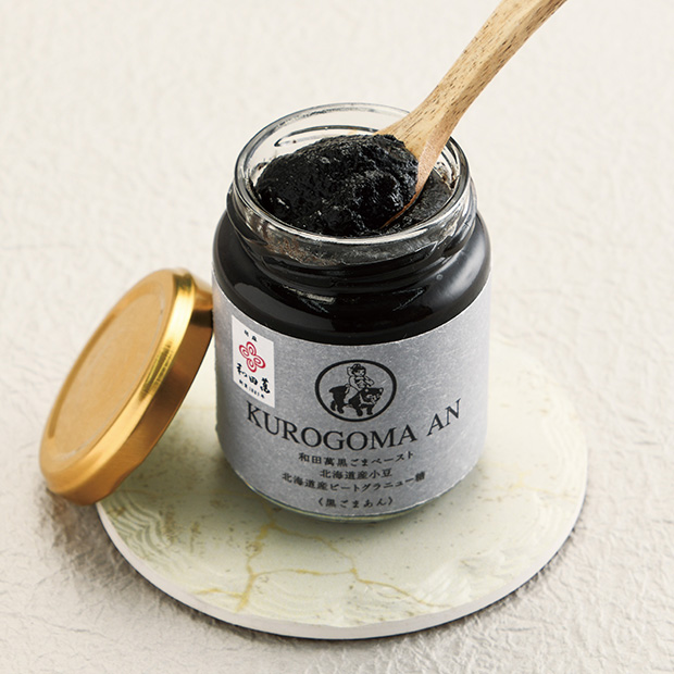 『創業1883年和田萬』の黒ごまペーストを、厳選した北海道産小豆と北海道産グラニュー糖で炊き上げたあんに練り込みました。