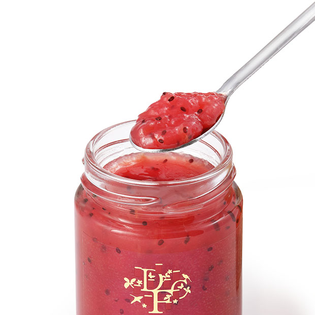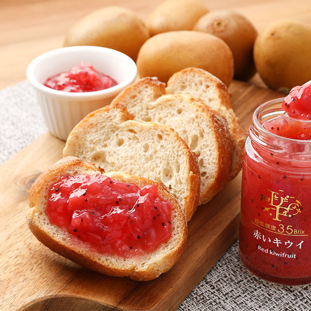 貴重な赤色果実のキウイフルーツを使用。本来の味を活かすため、甘さは控えめにしました(糖度35°)。フルーティーなジャムです。